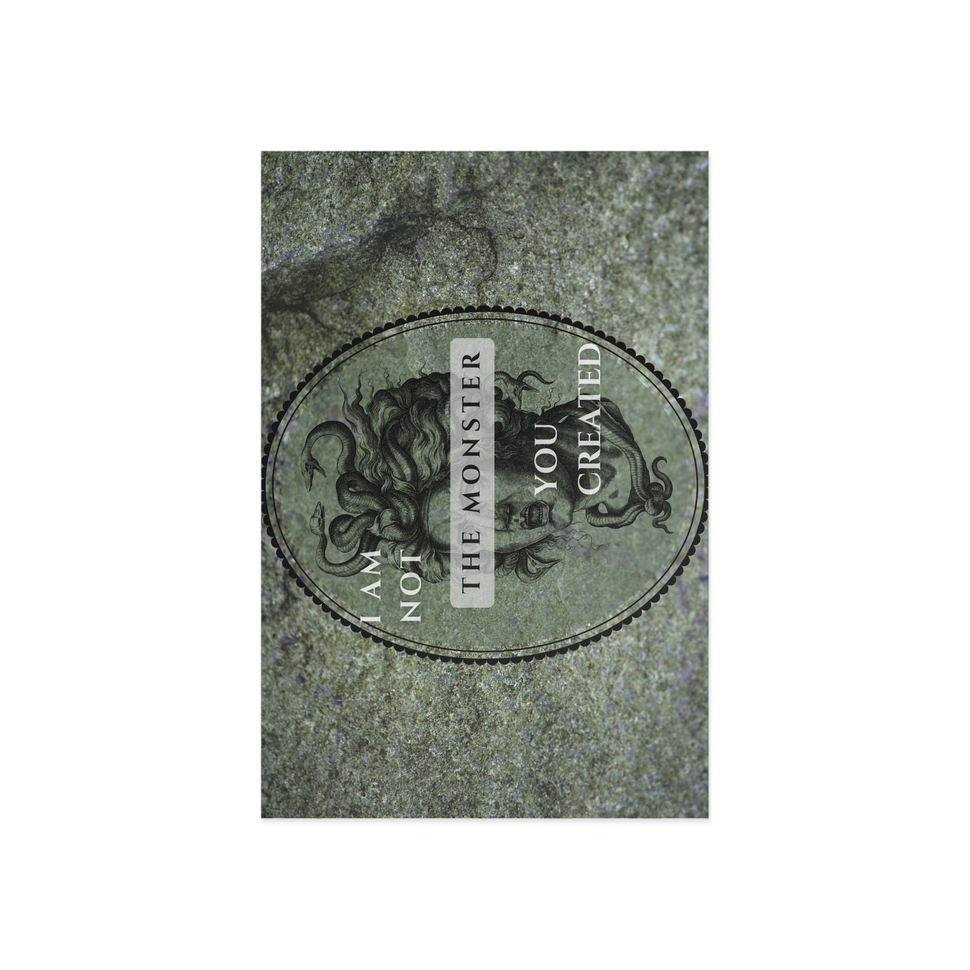 These fine art postcards evoke a dark, ritual-like elegance—deep black backgrounds, a pale classical visage, and a subtle ouroboros woven into the design. Printed with a glossy, high-detail finish, each card carries luminous contrast and quiet intensity. A small keepsake for altars, letters, or studio walls.